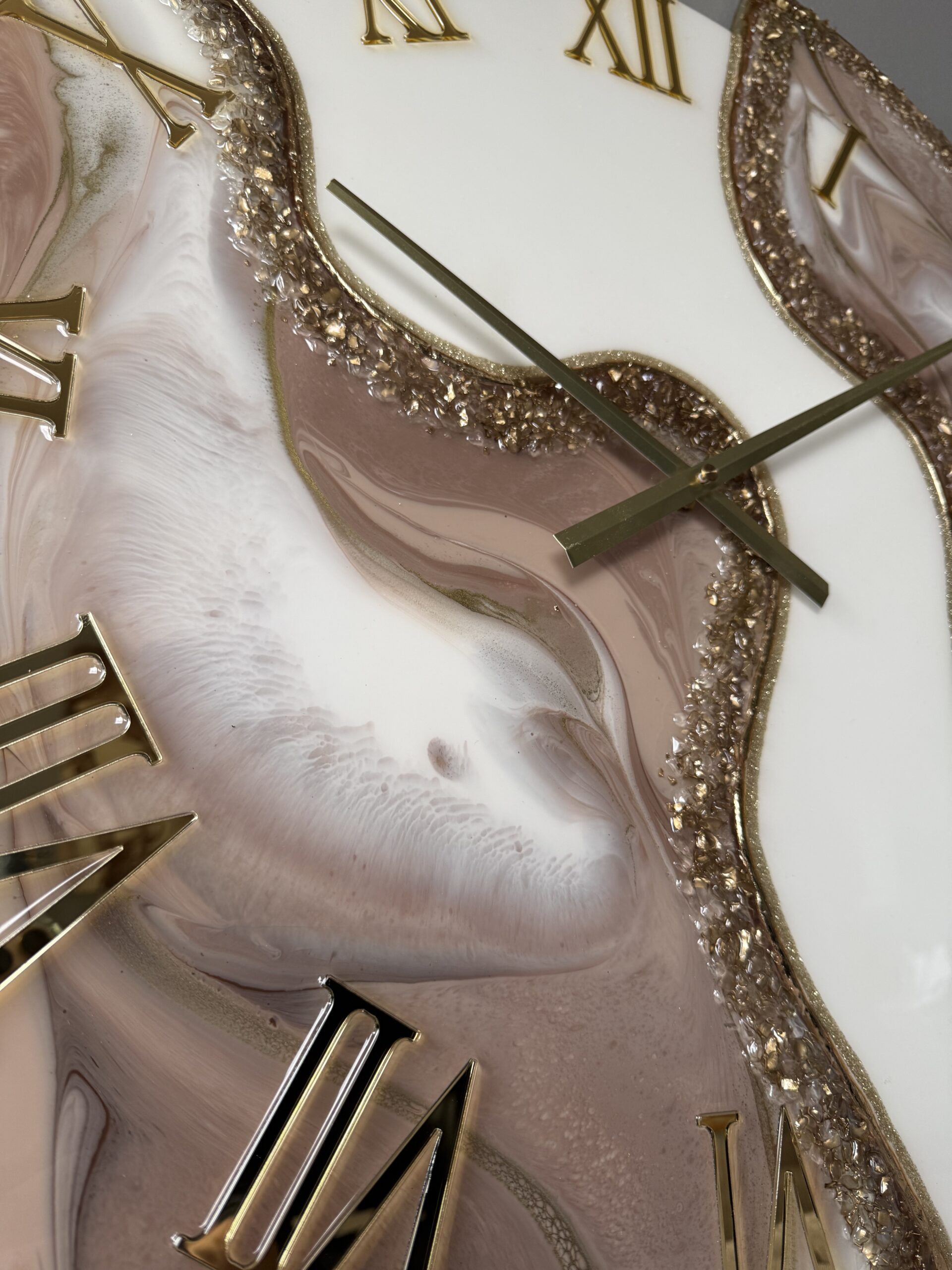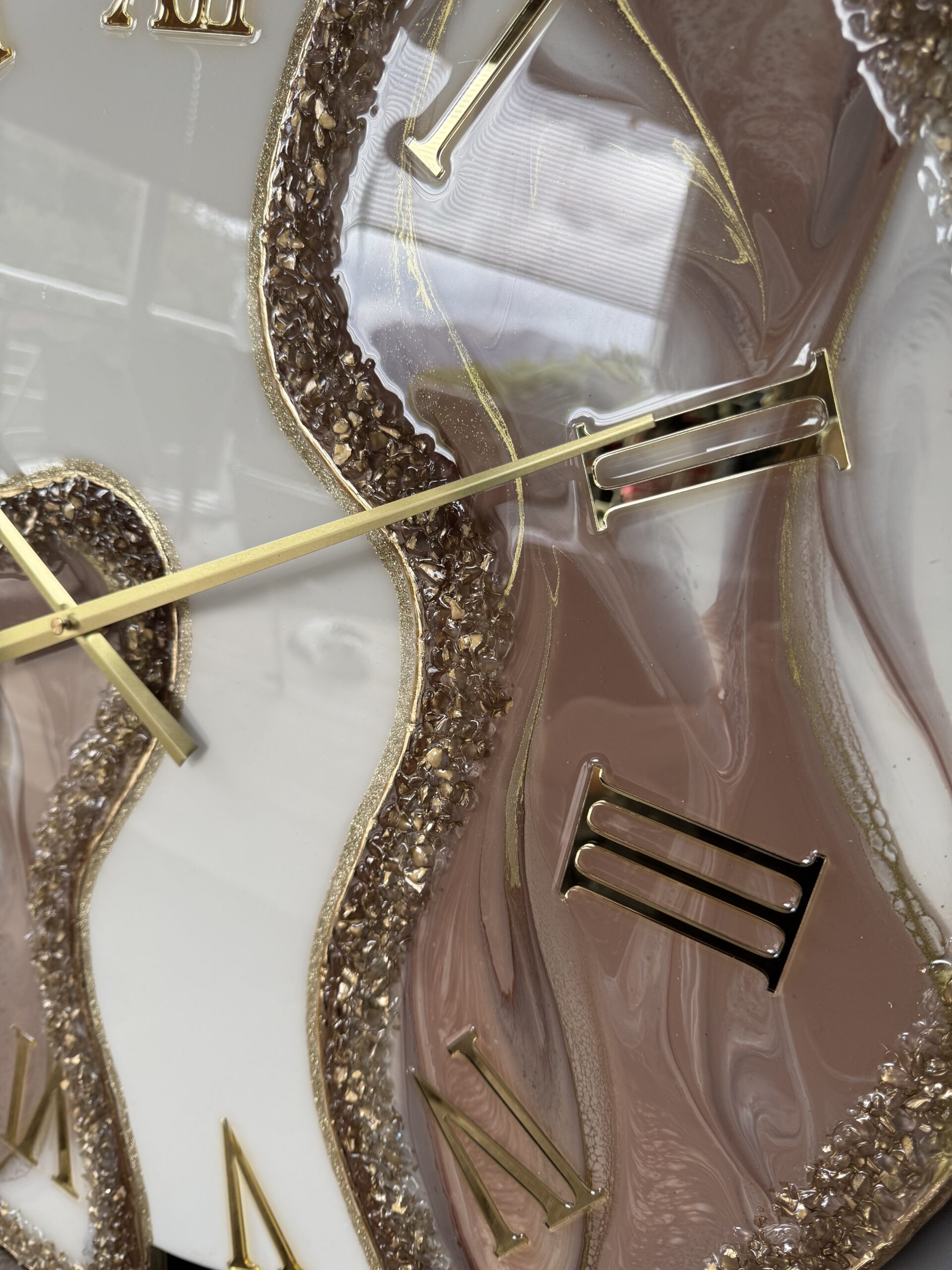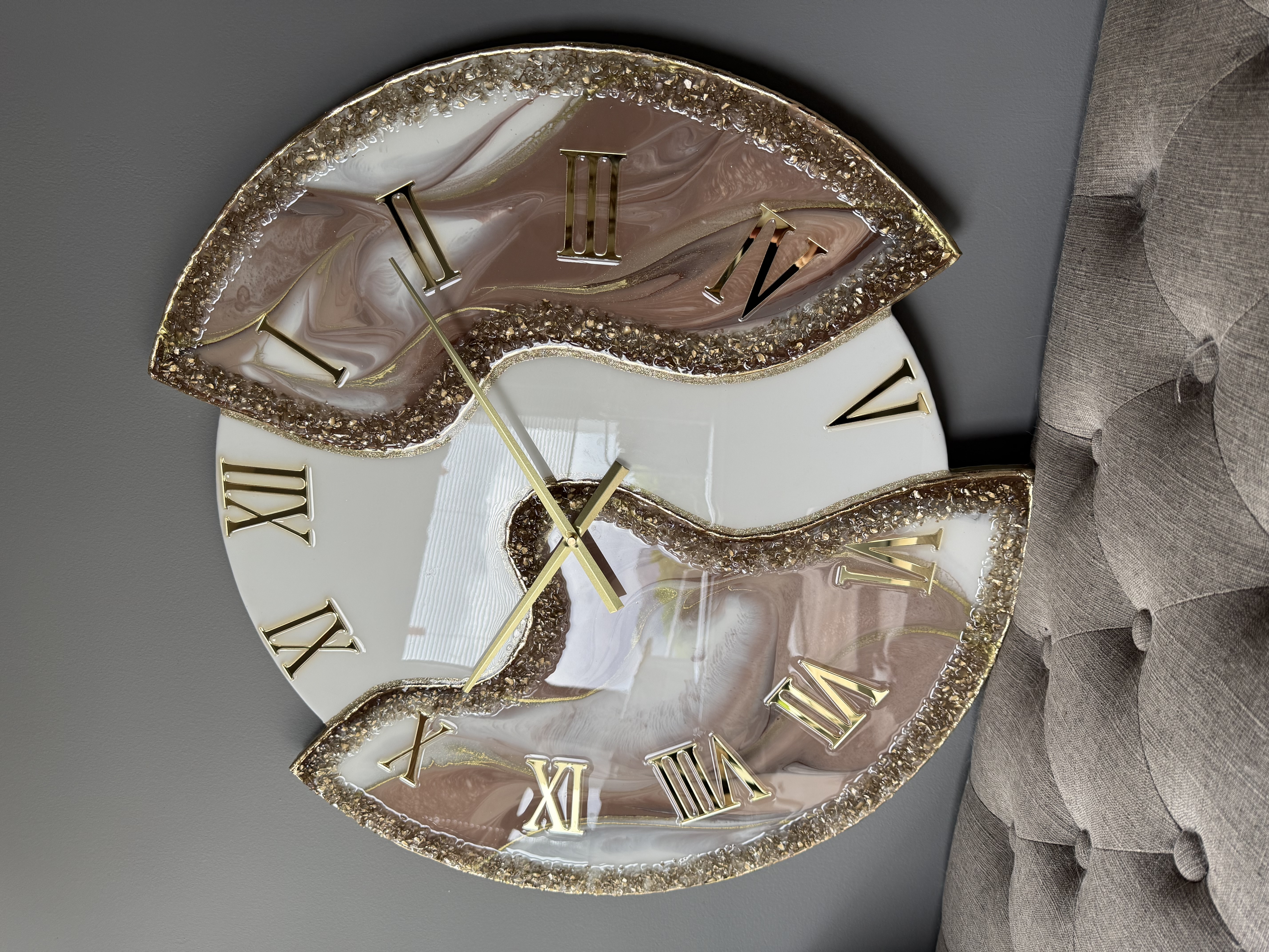 Les horloges sont fabriquées à partir de bois MDF et de résines époxy ; s’y ajoutent des pigments, paillettes et/ou d’autres matériaux créatifs.