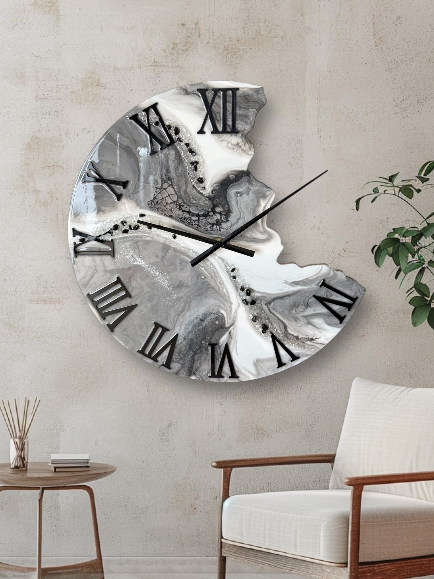 Horloge en résine époxy, 60cm de diamètre. Vous pouvez l’installer dans votre salon ou n’importe quelle pièce de votre choix ; la résine époxy lui donne une brillance exceptionnelle. C’est un vrai bijou qui ornera votre intérieur.