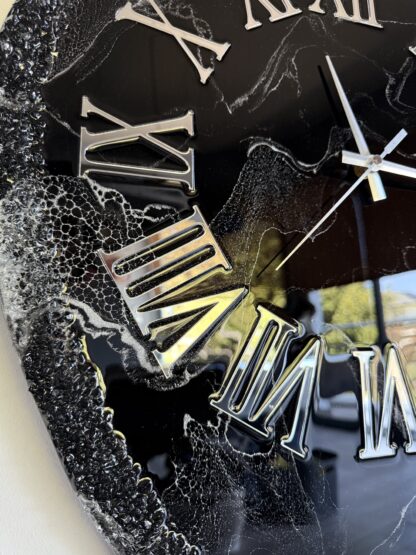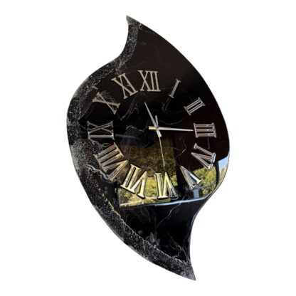 Les horloges sont fabriquées à partir de bois MDF et de résines époxy ; s’y ajoutent des pigments, paillettes et/ou d’autres matériaux créatifs.