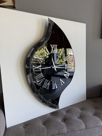 Horloge en résine époxy sur MDF. Dimensions : 84x50cm.