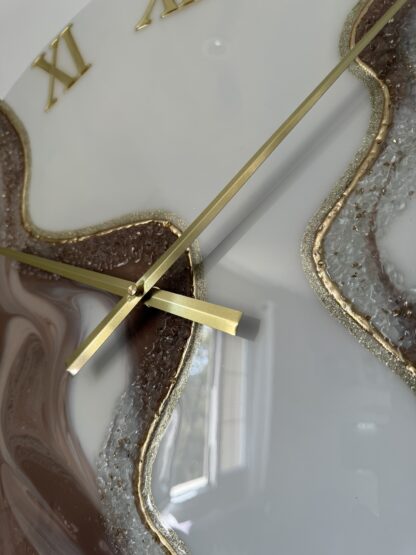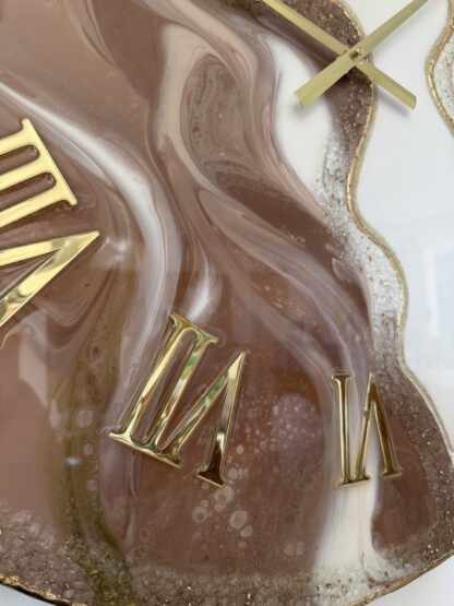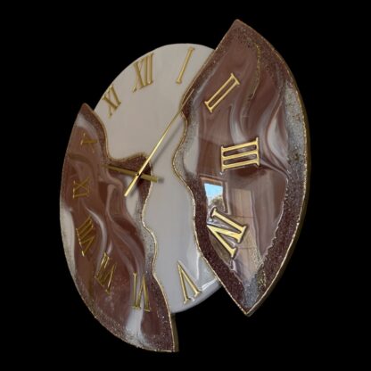 Les horloges sont fabriquées à partir de bois MDF et de résines époxy ; s’y ajoutent des pigments, paillettes et/ou d’autres matériaux créatifs.