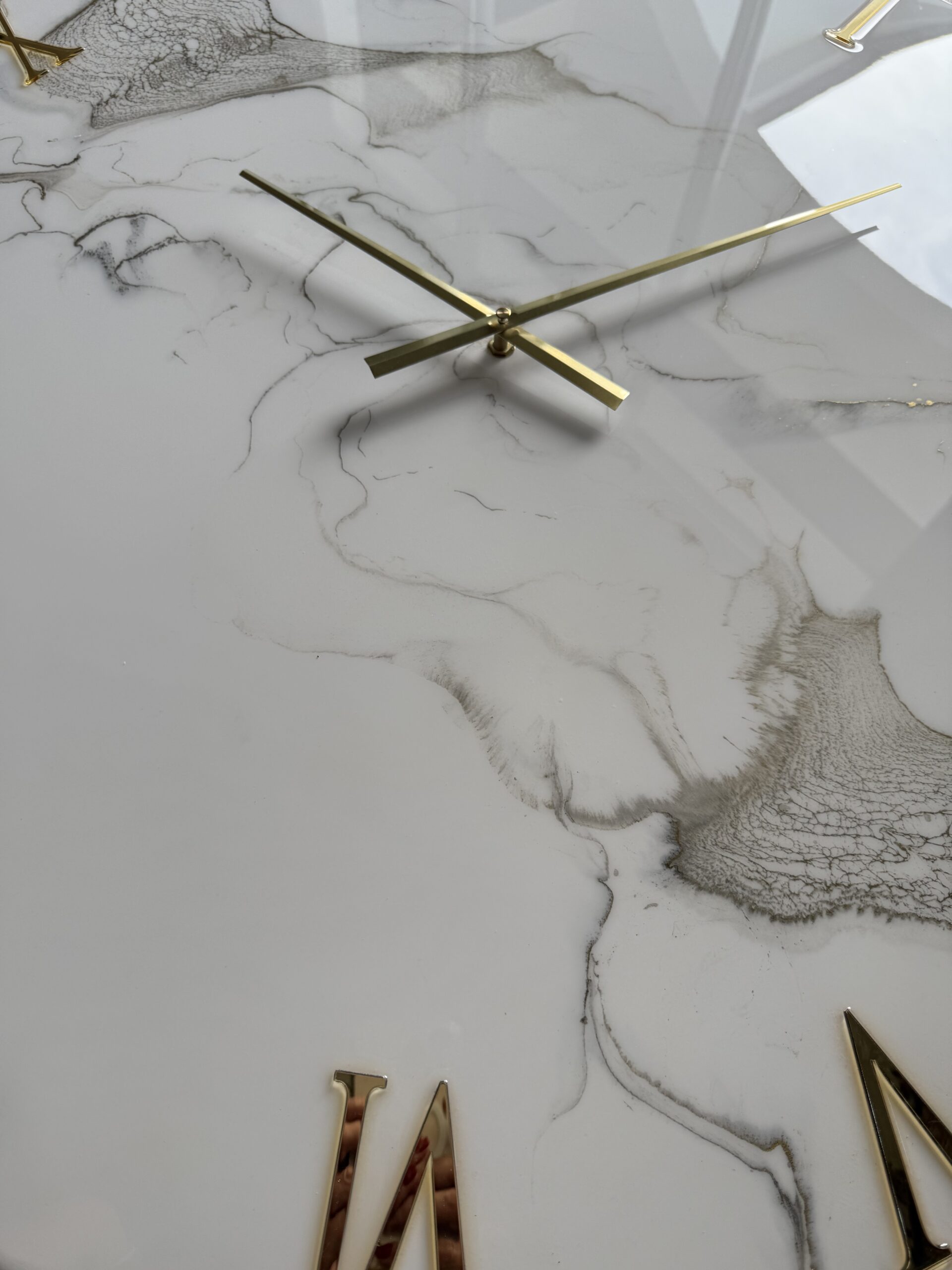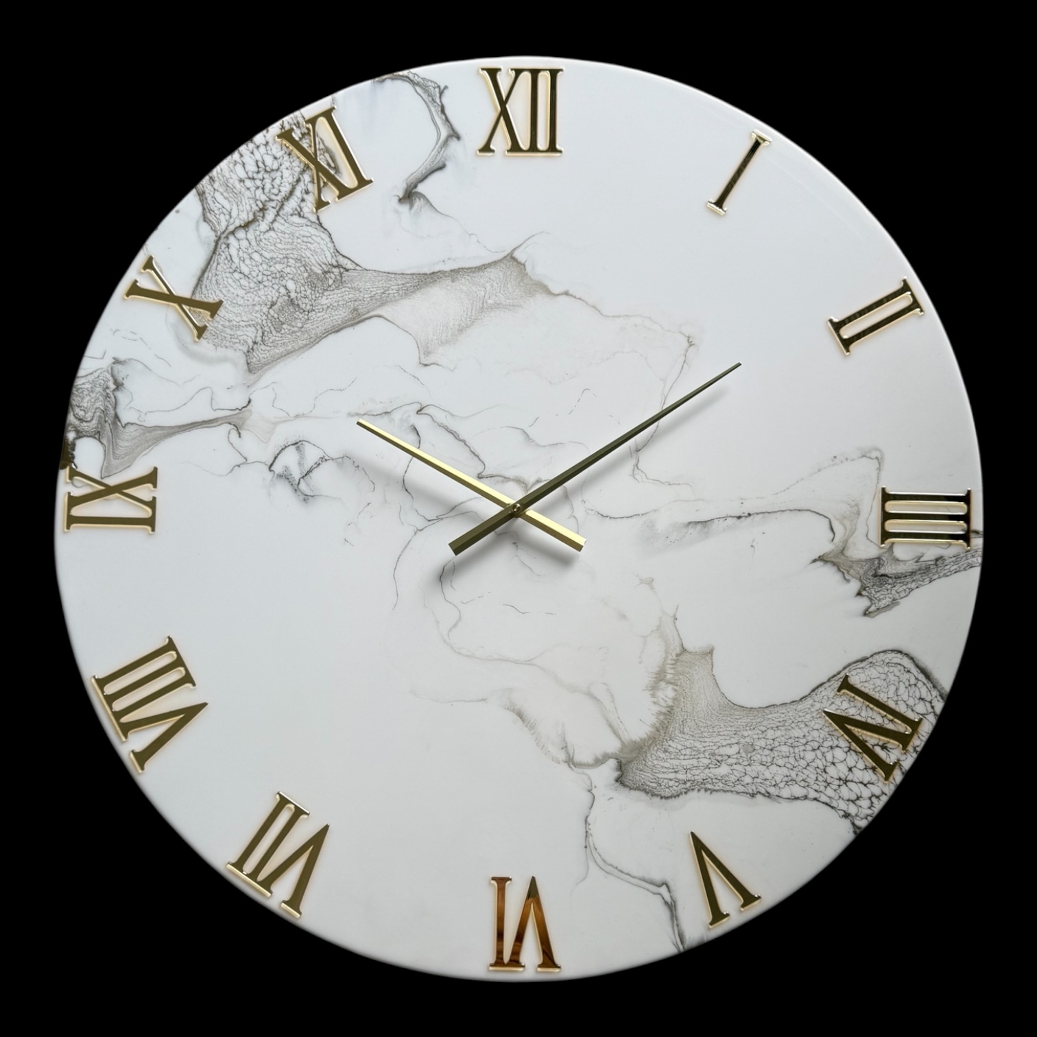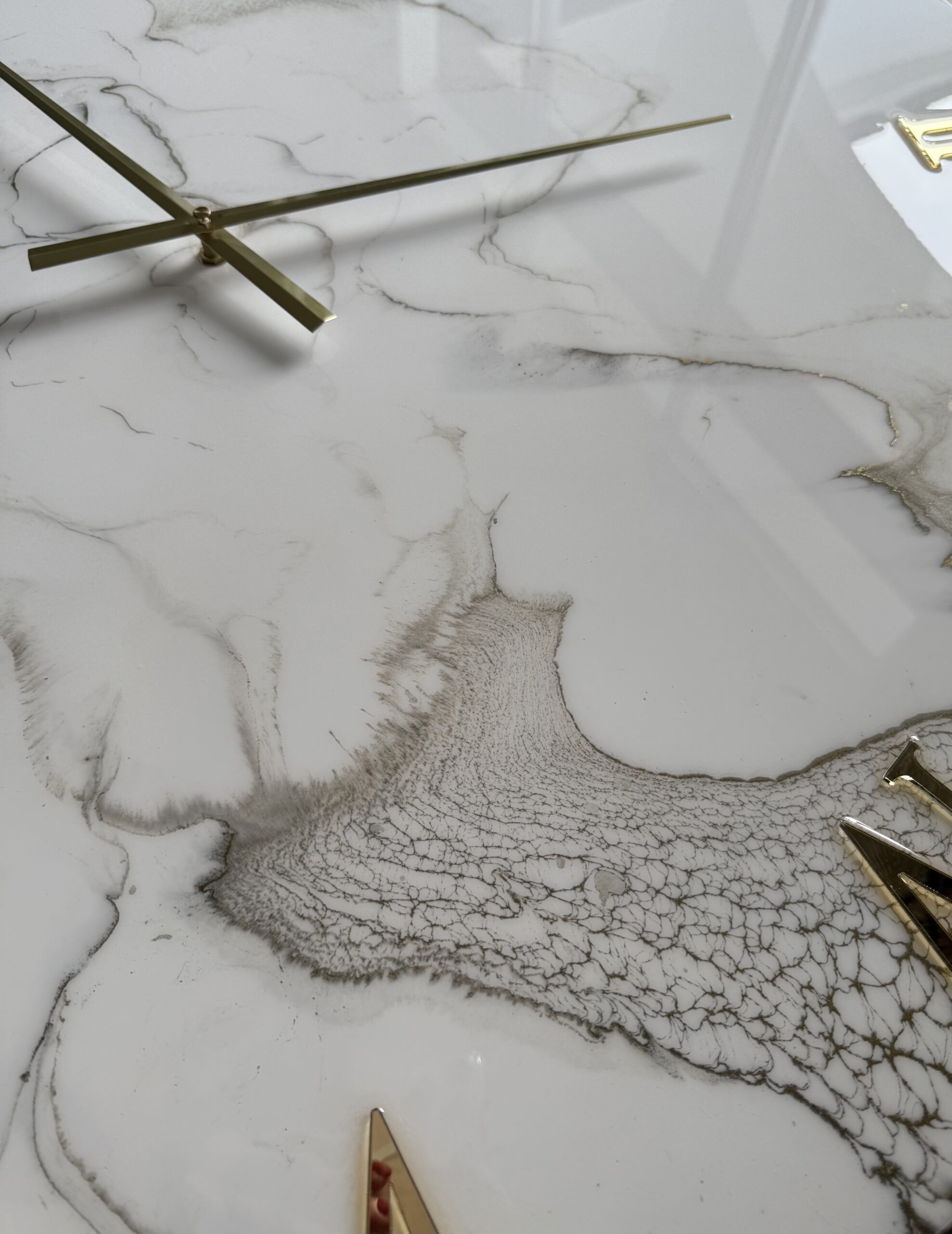 Les horloges sont fabriquées à partir de bois MDF et de résine époxy, s’y ajoutent des pigments, paillettes et/ou d’autres matériaux créatifs.