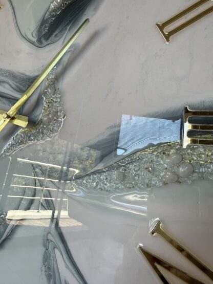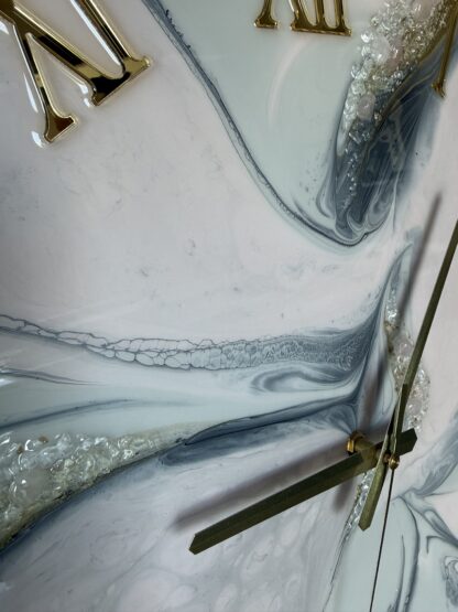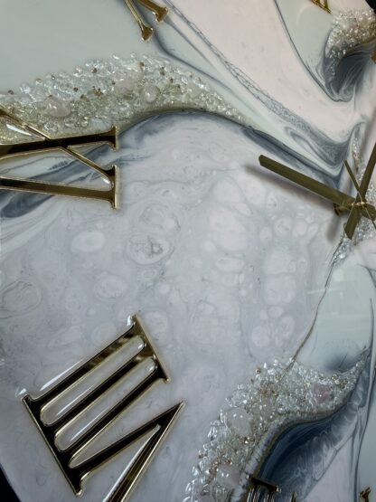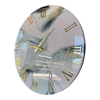 Les horloges sont fabriquées à partir de bois MDF et de résines époxy ; s’y ajoutent des pigments, paillettes et/ou d’autres matériaux créatifs.