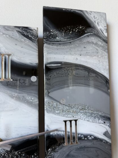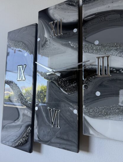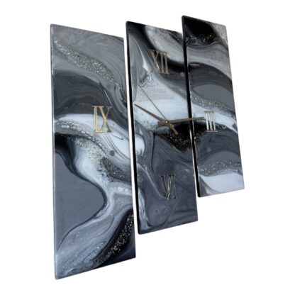 Horloge en résine époxy sur MDF. Dimensions : 3x 15,8x47cm.